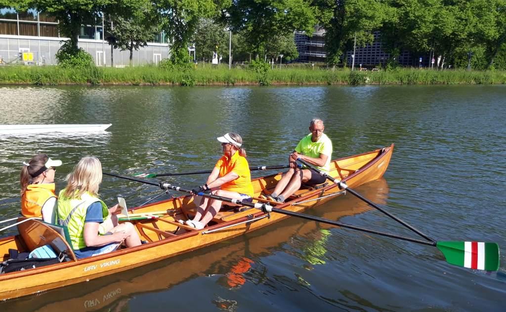 Na het verzamelen op vereniging, vertrokken wij (met Marijke in de bezemwagen) om 8 uur naar roeivereniging Viking in Utrecht. Daar werden wij vorstelijk ontvangen met koffie en taarten en werden de laatste instructies gegeven aan roeiers en captains. Ook kreeg elke boot de vraag om tijdens de tocht uit te vinden waarom de organisatoren de Minnies werden genoemd: roei- en denkwerk dus! De wherries van Viking waren de dag ervoor uit Italië wedergekeerd en zagen er prachtig uit: vier houten boten en één polyester. Zo begon de tocht eerst over het rechte kanaal van de Vaartsche Rijn naar de Utrechtse grachten. In de grachten waren de sporen van de Pride van 3 juni goed te zien, veel kleuren ballonnen en andere plastic soup waren onderdeel geworden van het uitzicht, wat de pret echter niet drukte.
