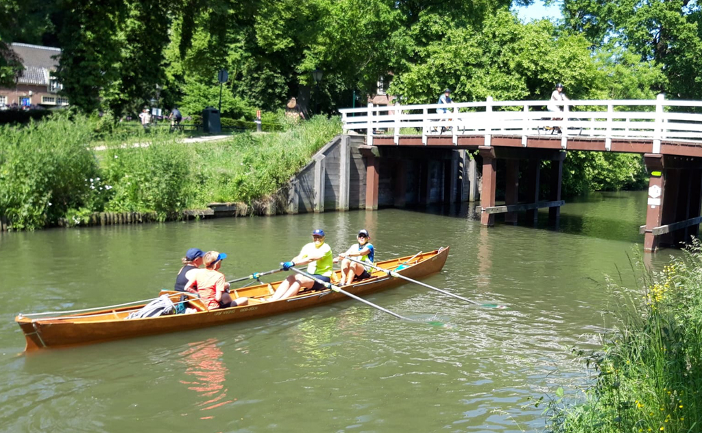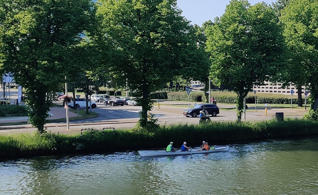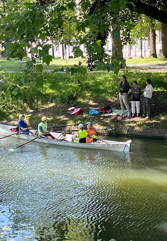 Want wat een mooie stad vanaf het water! De singel loopt nu volledig rond Utrecht en biedt een prachtig uitzicht vanaf het water, van de Stadsschouwburg tot de Oranje Brug en van Tivoli Vredenburg tot Lepelenburg. Maar daar bleef het niet bij: onderweg zorgde de organisatie voor mooie momenten! Zo werden de roeiers een halt toegeroepen en werd er een heus A-capella zangconcert gegeven door het internationaal vocaal ensemble Amusing. Verderop werden Eemtasjes met eten en drinken met een hengel aangereikt, waarna we de tocht vervolgden richting het landgoed Rhijnauwen, de stad verlatend.