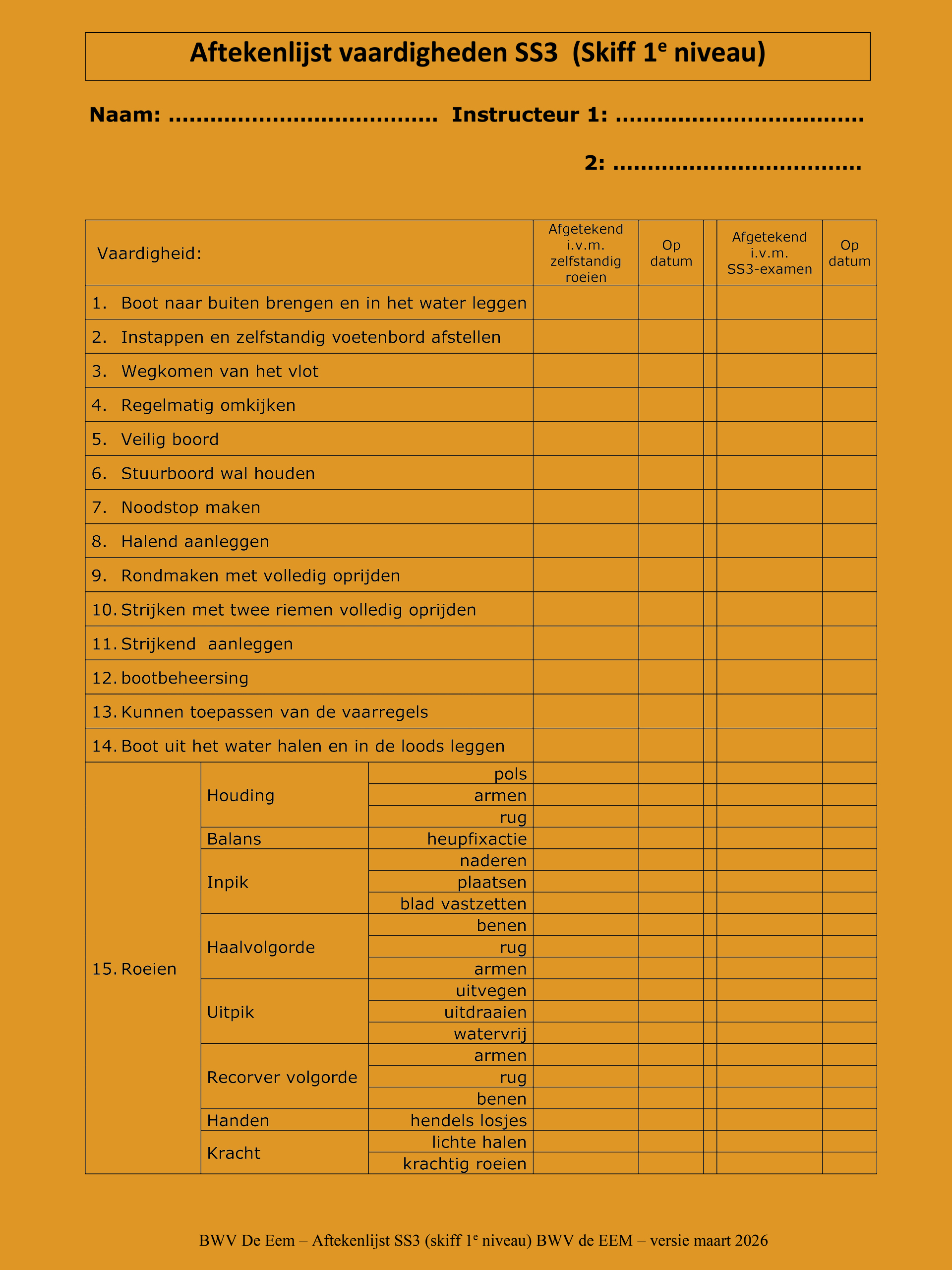 • Wanneer behaal ik dit niveau? Na een volledig instructieseizoen kan de instructeur bepalen of je voldoende vaardig en veilig kunt roeien. Dat wordt afgetekend en daarna mag je, onder voorwaarden, zonder instructeur kilometers maken. Ondertussen volg je nog steeds de instructie. Zijn de overige onderdelen ook afgetekend dan kun je tijdens een officieel examenmoment aan examinatoren laten zien dat je alle vaardigheden voor SS3 goed beheerst.